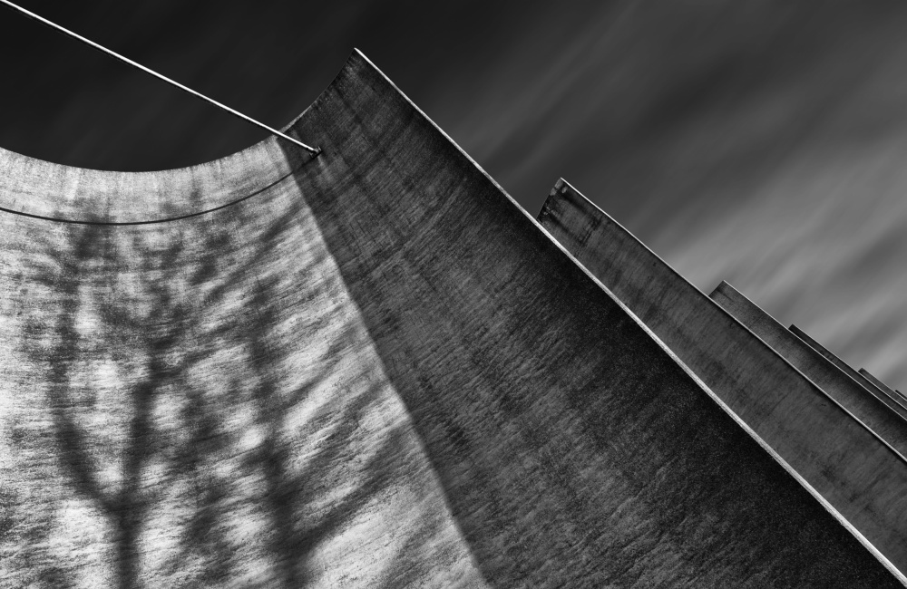 On a sunny day Jeroen van van der Wiel photographed the sturdy wind breakers, that protect the harbour of Rotterdam. The sun casts a nice shadow of trees bending in the wind on the concrete wall, giving it a more friendly look. By photographing the wall in a diagonal position, Jeroen shows how solid and sturdy it is and he also avoids a lot of sky by doing so. That doesn't mean, he didn't have to work on this sky. It most likely was full of white clouds and Jeroen changed it into a smooth and pleasing part of his photo, but there is more to it. When you study the image, you will discover that the shadows of the branches of the tree match the stretched out forms of the clouds. A clever piece of work!