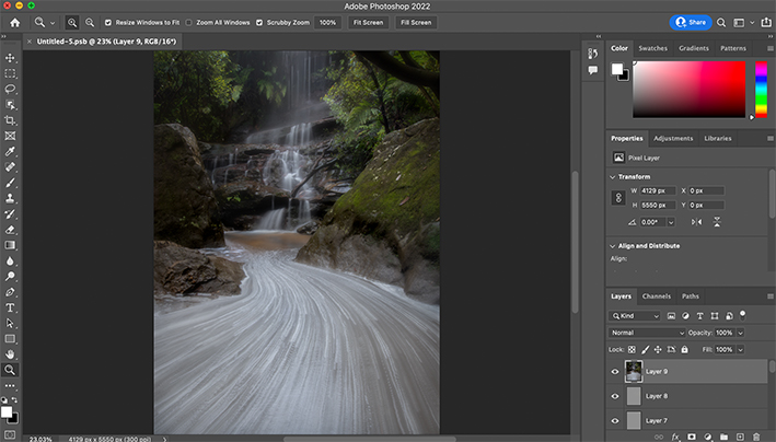As I wanted my final image to be as sharp as possible from front to rear, I took ten individual shots with the same composition, but each of them was focused on different spots of the scene – focusing on the rocks on the right and left sides in the middle ground, tree branches on the right, waterfall itself, and tree leaves on the background near and behind the waterfall.